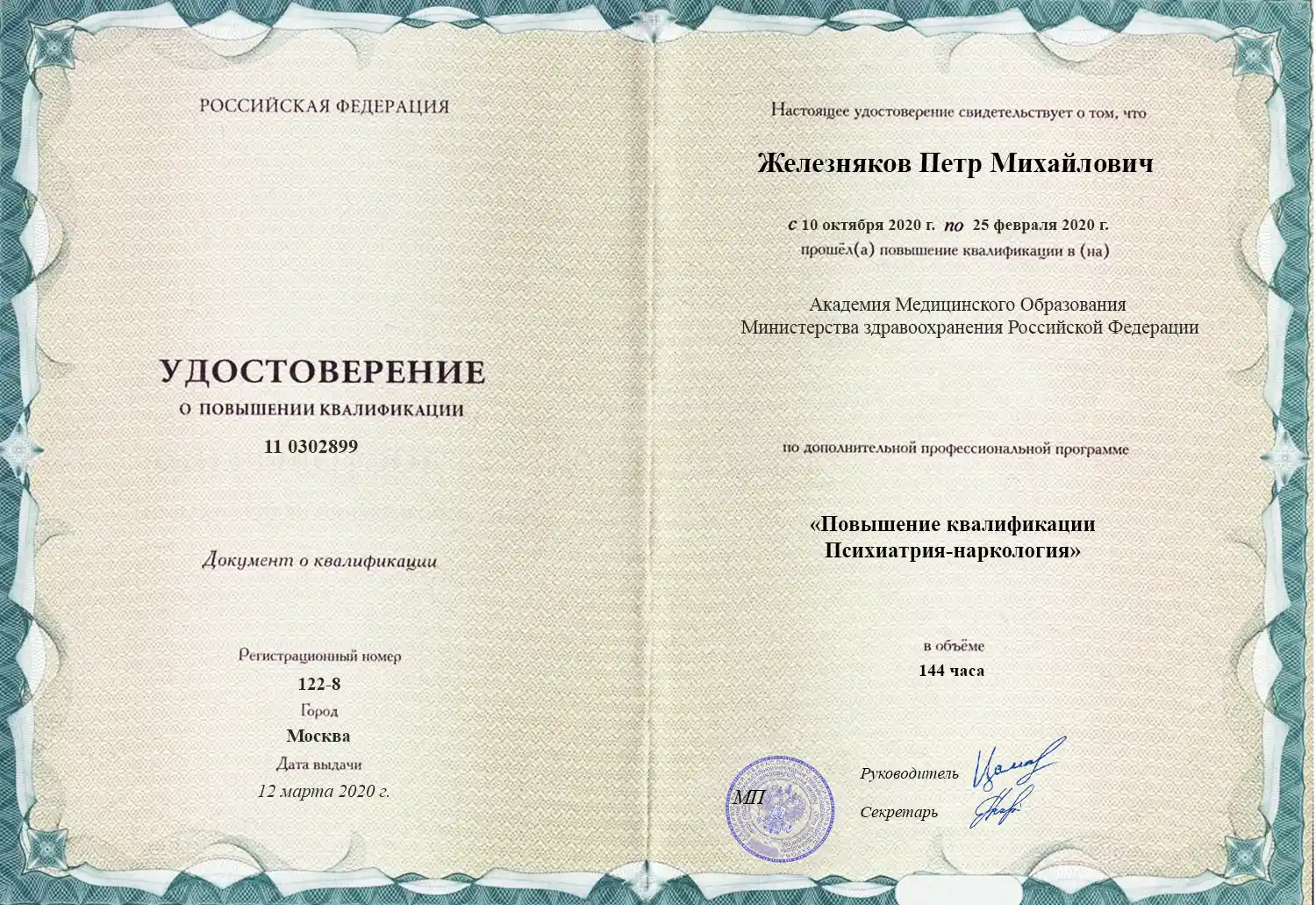 В 2007 году окончил Уральский государственный медицинский университет по специальности «Лечебное дело». В 2010 году прошёл профессиональную переподготовку по аддиктологии, получив квалификацию для работы с зависимыми пациентами. В 2020 году прошёл повышение квалификации по психиатрии-наркологии, расширив компетенции в диагностике и терапии психических и аддиктивных расстройств.